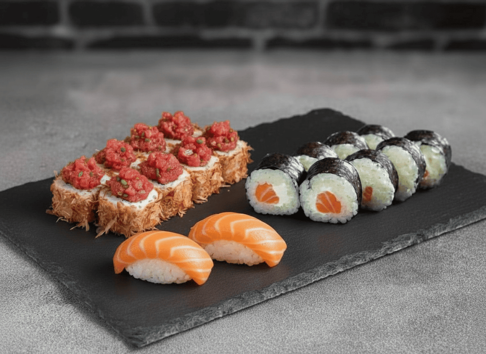 · Ролл Тартар с тунцом (тартар из тунца), рис, нори, сливочный сыр, огурец, стружка тунца, соус Унаги) · Ролл с лососем и сыром (лосось, сливочный сыр, рис, нори) · Суши с лососем 2 шт. (лосось, рис)