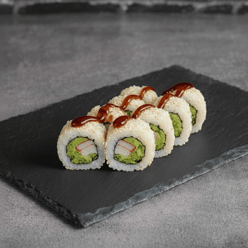 Сурими, огурчик, соус гуакомоле, рис, нори, соус унаги