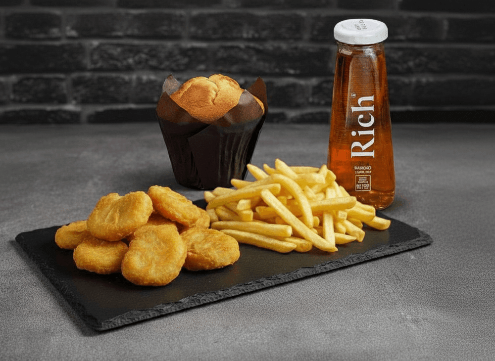 · картофель фри · наггетсы · маффин ванильный · сок Rich яблочный 0,2 л