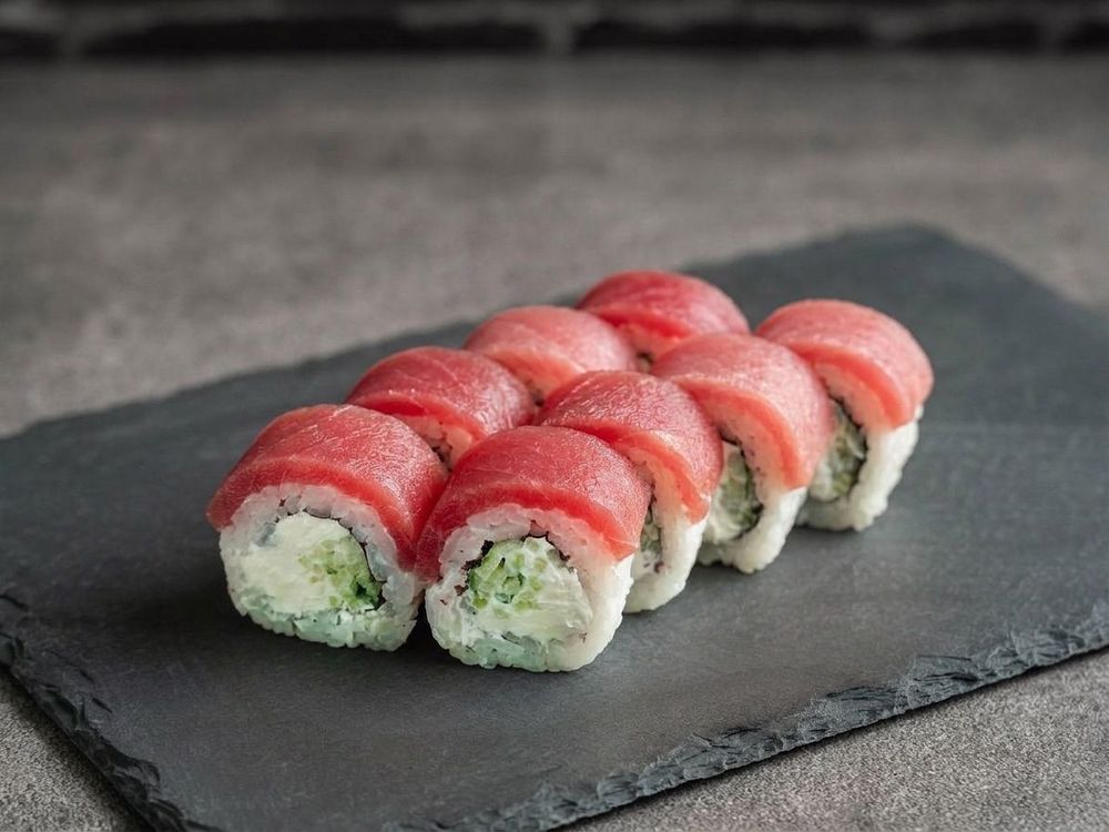 Нежная «Филадельфия» в новой интерпретации: сливочный сыр и свежий огурец под ломтиком премиального тунца. Изысканно и сбалансированно.