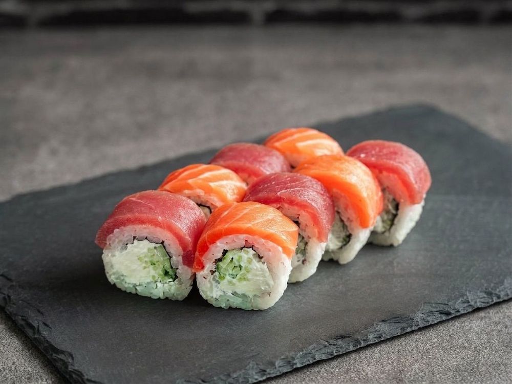 Лосоь, тунец, сливочный сыр, огурец, рис, нори