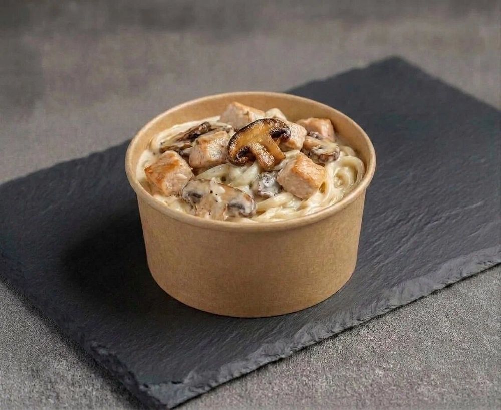 Сытное и ароматное блюдо, которое сочетает нежную пшеничную лапшу, сочное куриное филе и грибы, тушёные в кремовом соусе. Вкус лапши дополняет настоящий ароматный сыр пармезан.