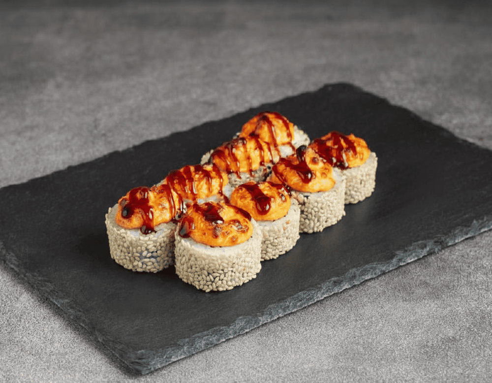 Лосось, сливочный сыр, пикантный сырный соус, огурец, рис, нори, соус унаги, кунжут. 8 шт
