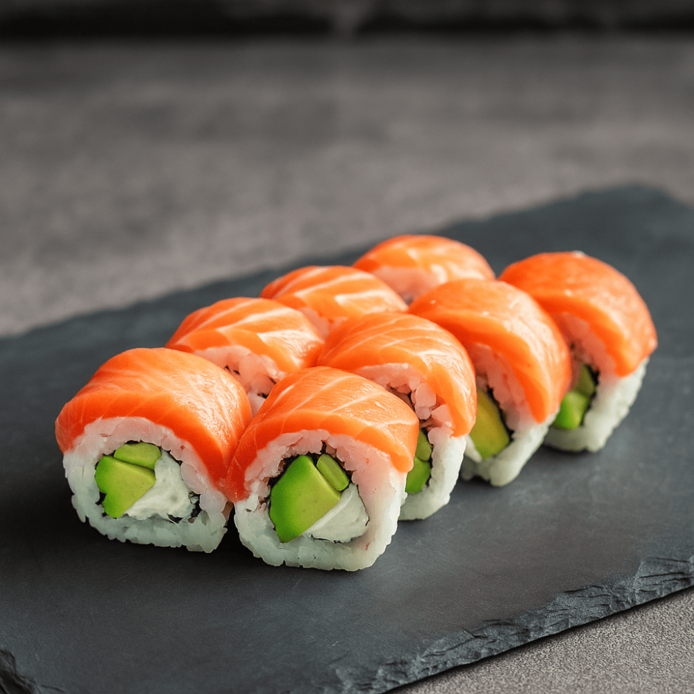 Лосось, сливочный сыр, авокадо, рис, нори.