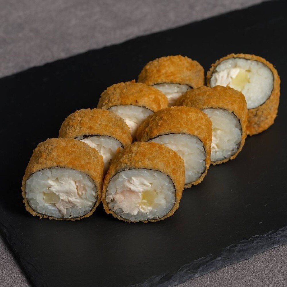 Копченая курица, сливочный сыр, ананас, нори, рис, темпура 8 шт