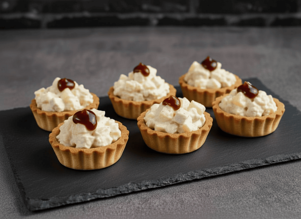 Копченая курица, ананас, майонез, соус терияки, тарталетки